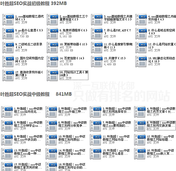 本套深一SEO視頻培訓課程包括20部高清視頻+清晰語音+整齊的文本條目,手把手教會快速從主流搜索引擎上獲得排名,從而獲得無限網絡商機。