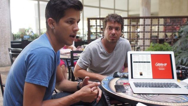 《Vistar》興辦者兼構(gòu)思總監(jiān)羅賓·佩德拉加(左)和他的兄弟、AlaMesa聯(lián)合創(chuàng)始人揚(yáng)戴爾·古鐵雷斯。《Vistar》是有關(guān)古巴年青人文明的電子雜志,AlaMesa是有關(guān)古巴飯館的網(wǎng)站和移動(dòng)運(yùn)用。