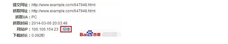 抓取診斷工具會(huì)檢查站點(diǎn)與百度的連接是否暢通,若站長(zhǎng)發(fā)現(xiàn)IP信息還是老舊的,可以通過(guò)“報(bào)錯(cuò)”通知百度搜索引擎更新IP,如下圖所示: